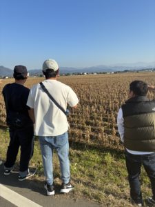 初日は、現地の田んぼや生産現場の視察を行いました。広大な農地や整備された環境を目の当たりにし、そのスケールの大きさに圧倒されると同時に、プロの現場ならではの空気感に大いに刺激を受けました。土作りや管理方法など、実際に現地に足を運んだからこそ分かる「本物」の情報。「久山ならどう活かせるか?」と、部員同士で熱心に意見を交わす時間となりました。